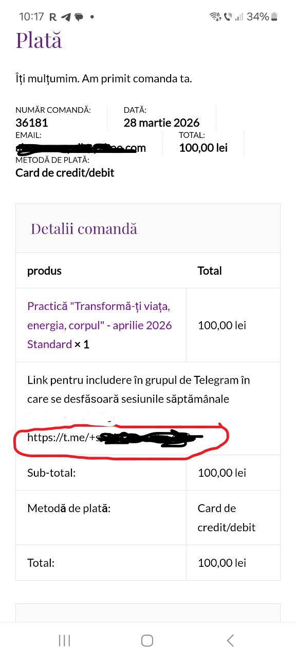 ATENȚIE: După efectuarea plății, imediat vă apare pe ecran linkul grupului de Telegram în care trebuie să intrați (vedeți în exemplificarea de mai jos; copy/paste linkul vizualizat în browserul dvs), în acel grup aveți acces săptămânal la sesiunile live Protocolul de Transformare Corporală. Dacă întâmpinați dificultăți în accesarea grupului de Telegram, vă rugăm să ne contactați la tel +40730503648. Dacă doriți să aveți acces atât la sesiunile live, cât și la înregistrarea sesiunilor, puteți opta pentru versiunea Protocolul de Transformare Corporală Premium aici.